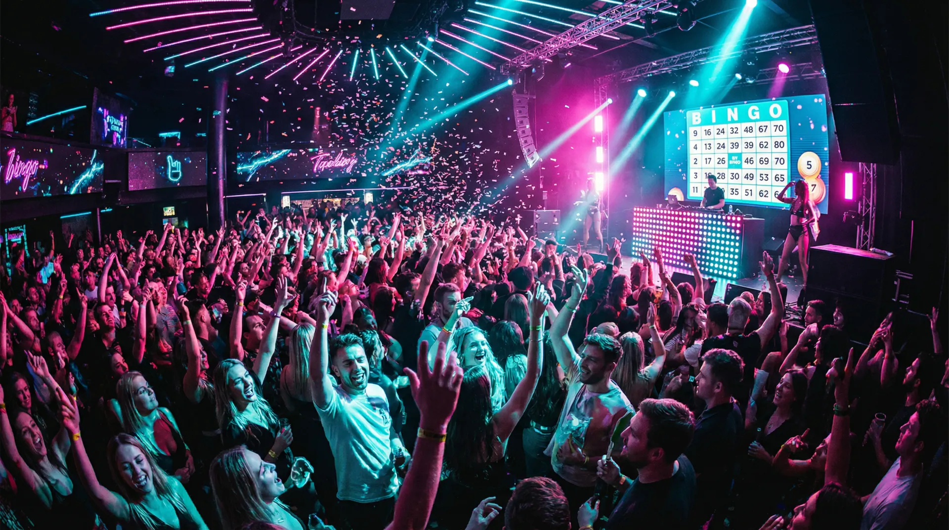Professional dancers and performers putting on a live show. DJ drops, dance battles, and karaoke chaos between bingo rounds. Non-stop bangers all night long.